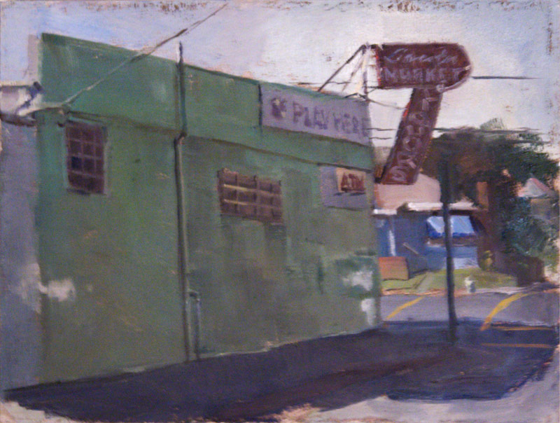 I experimented with making the sky a lot darker than I usually do. It worked to make the ground look more sunlit. Afterwards I went to Lincoln and Willow and painted this piece of the liquor store on the corner.