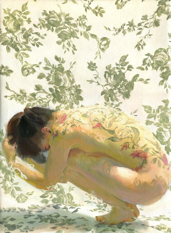 I first painted the pattern of the background cloth, then the tattoos on her back, then I fused them together by painting into and out of the figure.