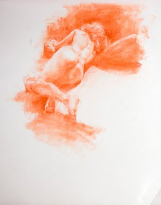 This week I started with using the sanguine chalk stuck in the palette-knife-contraption. This was a 10-minute drawing.