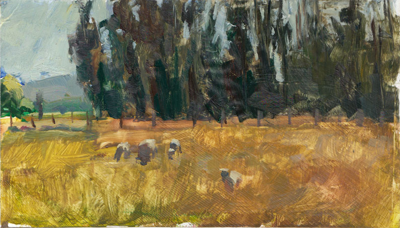 A lot of the grass on this painting is a thin scrubby layer of greens, yellows, and browns. There is some impasto in the sky and the sheep, sort of, but for the most part the lights are achieved with the white of the paper.