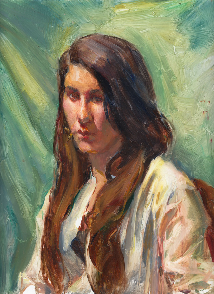I went to the life painting session in Petaluma to do this 3-hour pose from life with water-mixable oils on the Yupo. I purposely reversed my normal way of working by making the darkest darks the thickest part of the painting and lights almost exclusively achieve with the white of the paper. Almost no tube white was used in her face. I really like how it turned out. There is a good vibrancy to this one in person that may not translate over the computer.