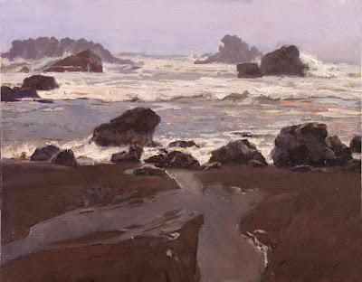 This one may be the hardest sell. Although this is my favorite in the depictions of the waves, it's probably the least prettiest in the tide. Also, people don't seem to get the way the drainage of the creek into the sea as much as I'd hoped. I tried to take it out, but it didn't work very well to take it out. I would make some major changes to this painting in terms of design if I had to do it over again. It's one of those paintings where you blind yourself to the basic flaws of it thinking you're going to plow through and rescue somehow.