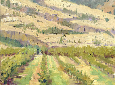 The next day we went to Sakura Ridge Farm to paint in the morning. The area is very picturesque, and had some interesting things to paint, but the danger in having too many good scenes laid out for you is that you could end up with too many trite simple paintings. I walked to the other side of the ranch and found a gorgeous view of the valley the river runs through. I had a limited amount of time to catch the remaining morning haze. I painted the background very quickly, perhaps to my advantage. This painting turned out well in its effectiveness of handling atmospheric perspective and not letting the blues overpower the painting.