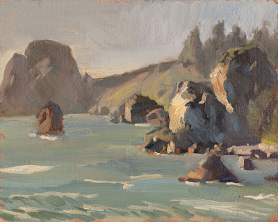 Along my road trip north I stopped at False Klamath Cove to paint this amazing scene. I don't know why they call it "False Klamath Cove" but it's a beautiful little piece of the Northern California coast. I painted this one with only a medium-sized bristle filbert. I had a lot of fun painting this one. I used a lot of grays to exaggerate the atmospheric perspective. This is a pretty muted color scheme going on here.