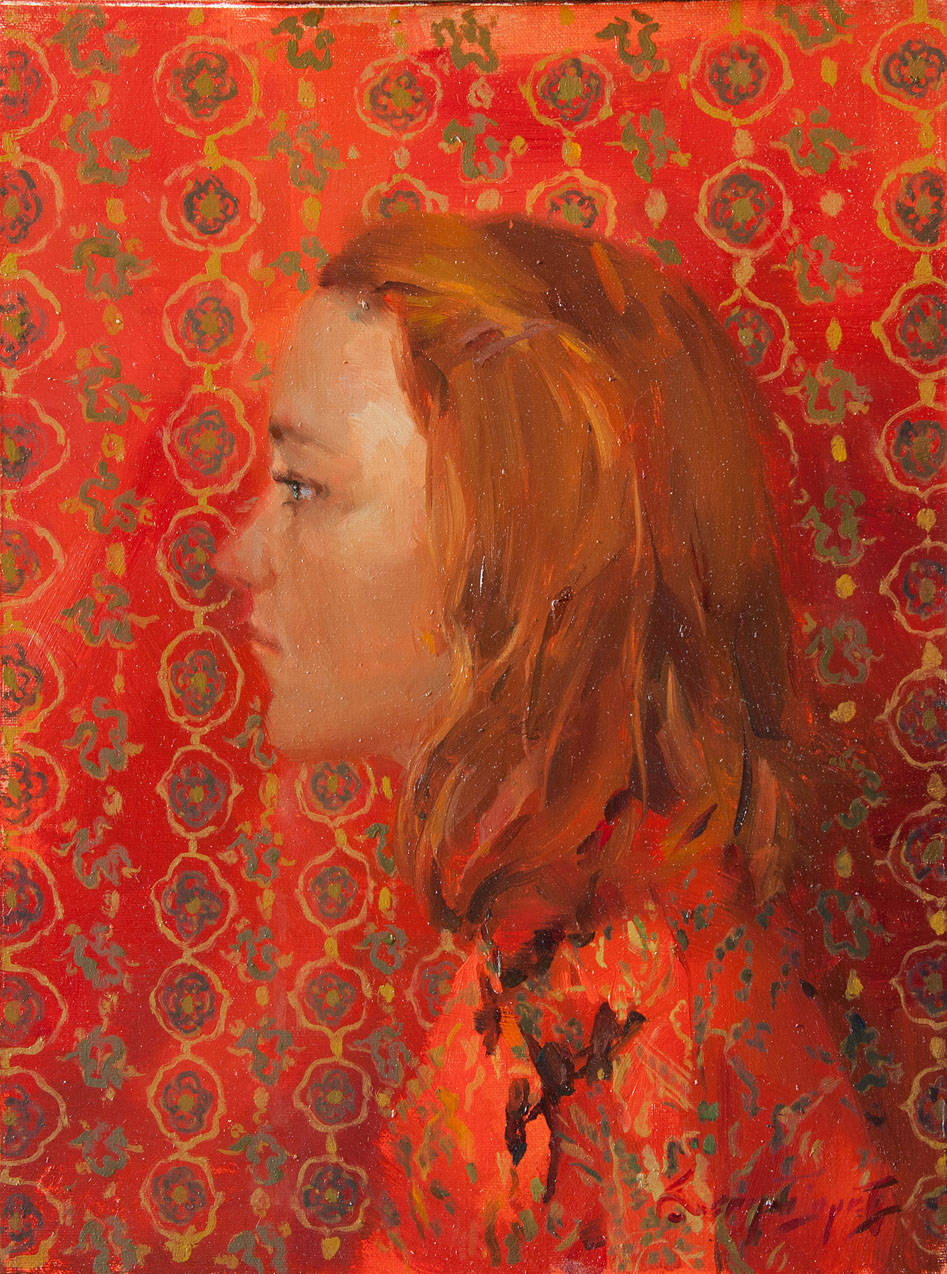 This painting is meant to be the "little sister" to the larger painting by Robert Van Vorst Sewell. Even though the gallery doesn't have a ton of figurative works, I wanted to take on a painting that I could showcase my skills in this regard. It let me play with the of my favorite subjects: females, patterns and profiles. The Sewell is about 3 feet high, and this painting is a mere 12 inches."Chinese Vermillion" 12x9 in. oil on linen board.