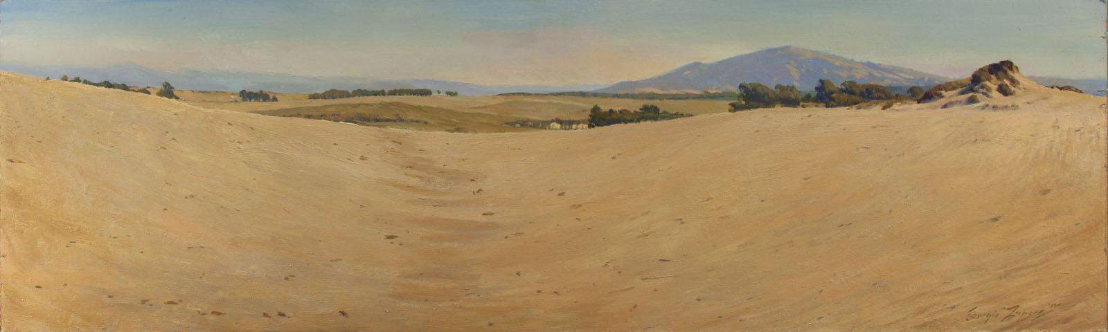 "Hiking The Dunes, Looking East," 12x40 in. oil on linen mounted on board.