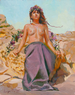 And now, a bit about the paintings and my thoughts behind the making. This series was a bit different for me, because it's the first time in quite a while where I haven't relied on some sort of visual "gimmick" to carry the theme along. The paintings are pretty straightforward in terms of execution, but they are still quite a departure from the reference photos they are based on. I am very interested in using more props in my work to bring an ambiguous narrative into my work. The mystery in this series I believe comes from deciding in your mind who she is, what type of place she inhabits, why does she carry this wreath of flowers into this desolate terrain? A lot of the fun that came from selecting from the reference was seeing which formation of rocks against the pose/drapery created the most interesting abstract design. The park itself is an amazing abstract sculpture garden, so it was just a matter of finding a great design within it.